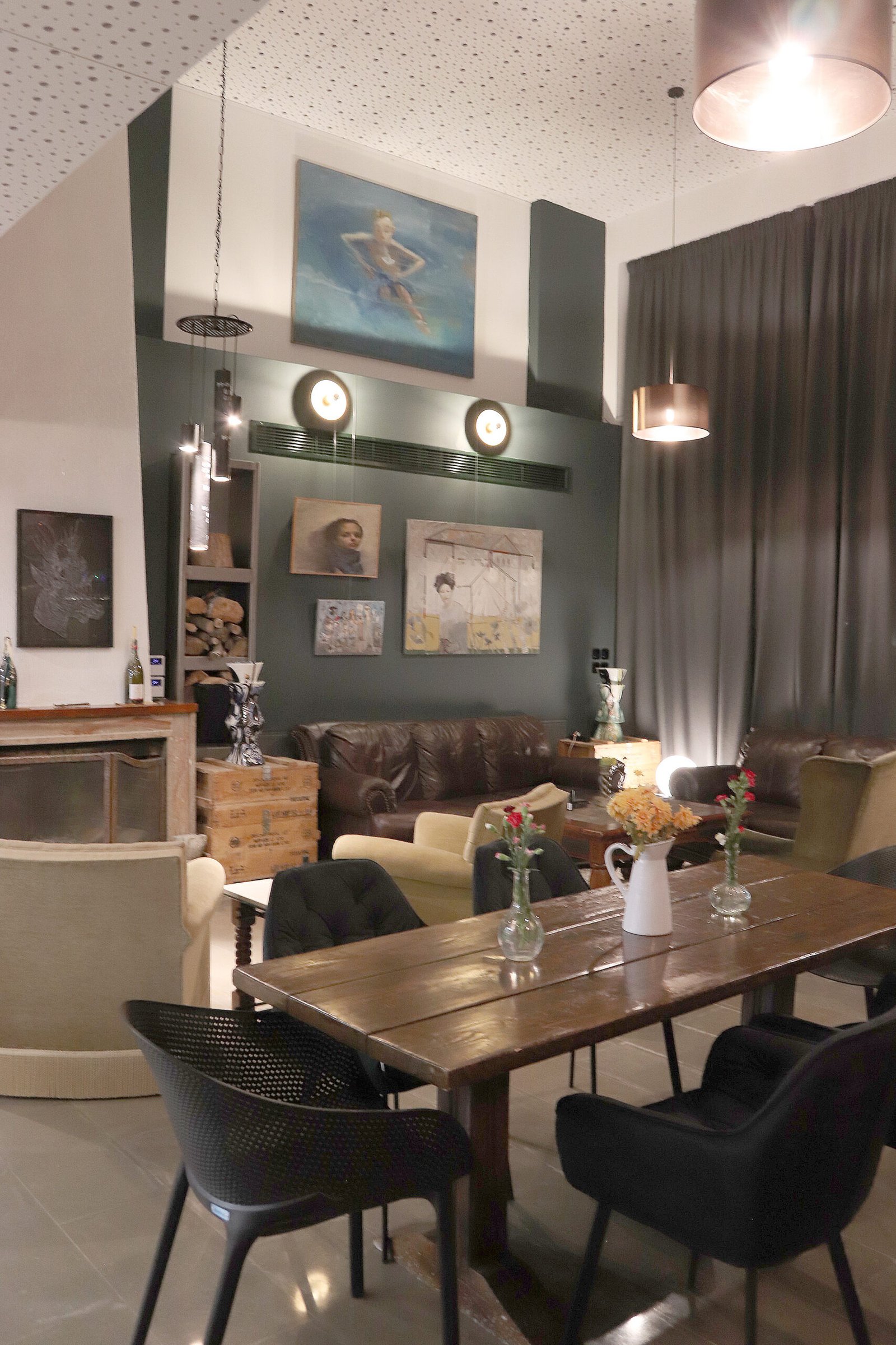 Open, industrial style space, decorated with vintage furniture, antique objects and art.